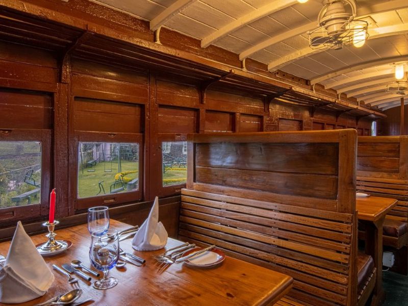 ホテルの敷地内には、20世紀初頭に茶葉を輸送するために使用されていた鉄道車両を綺麗に改装したダイニングレストランがあります(*「TCK 6685」はこの車両の現役時代の番号です)。車両の中は深みのあるバーガンディ色のチーク材で装飾されており、この車両の歴史的な歩み、ノスタルジーを感じさせてくれます。