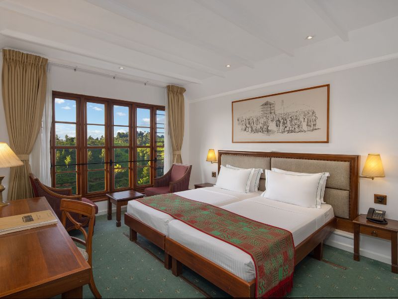 ヌワラエリヤにある、19世紀の紅茶工場を改装した5スタークラスのホテル。細い山道を登った、緑豊かな茶畑に囲まれた丘の上に建っています。