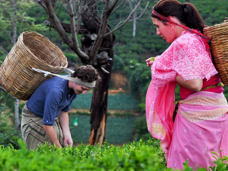 「ヘリタンス・ティー・ファクトリー」にはオーガニックの茶畑があり、そこで熟練の職人から茶摘みの作法を学び、実際に茶摘みを体験することができます(*女性にはサリー、男性にはサロンの貸し出しもあります)。